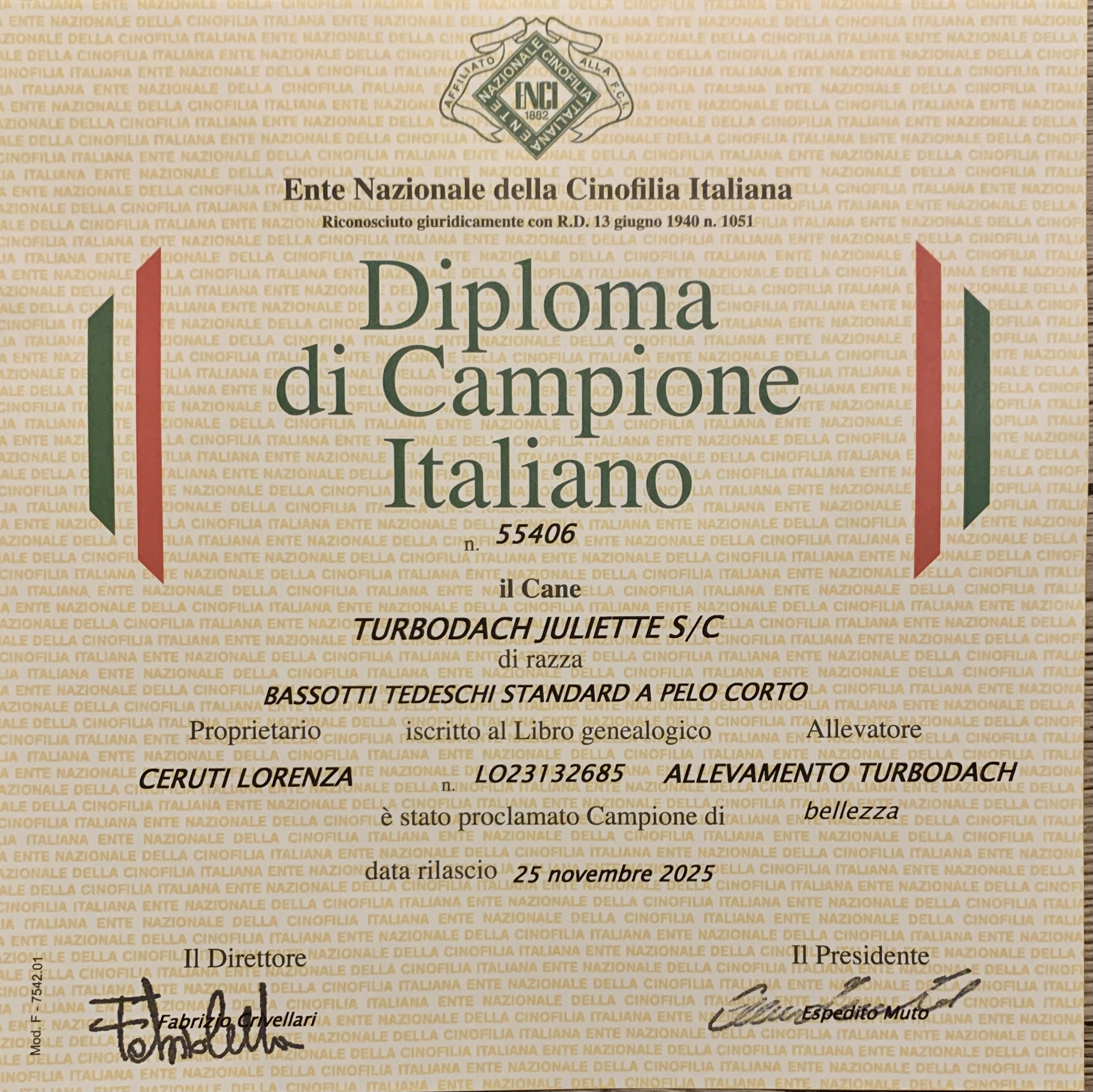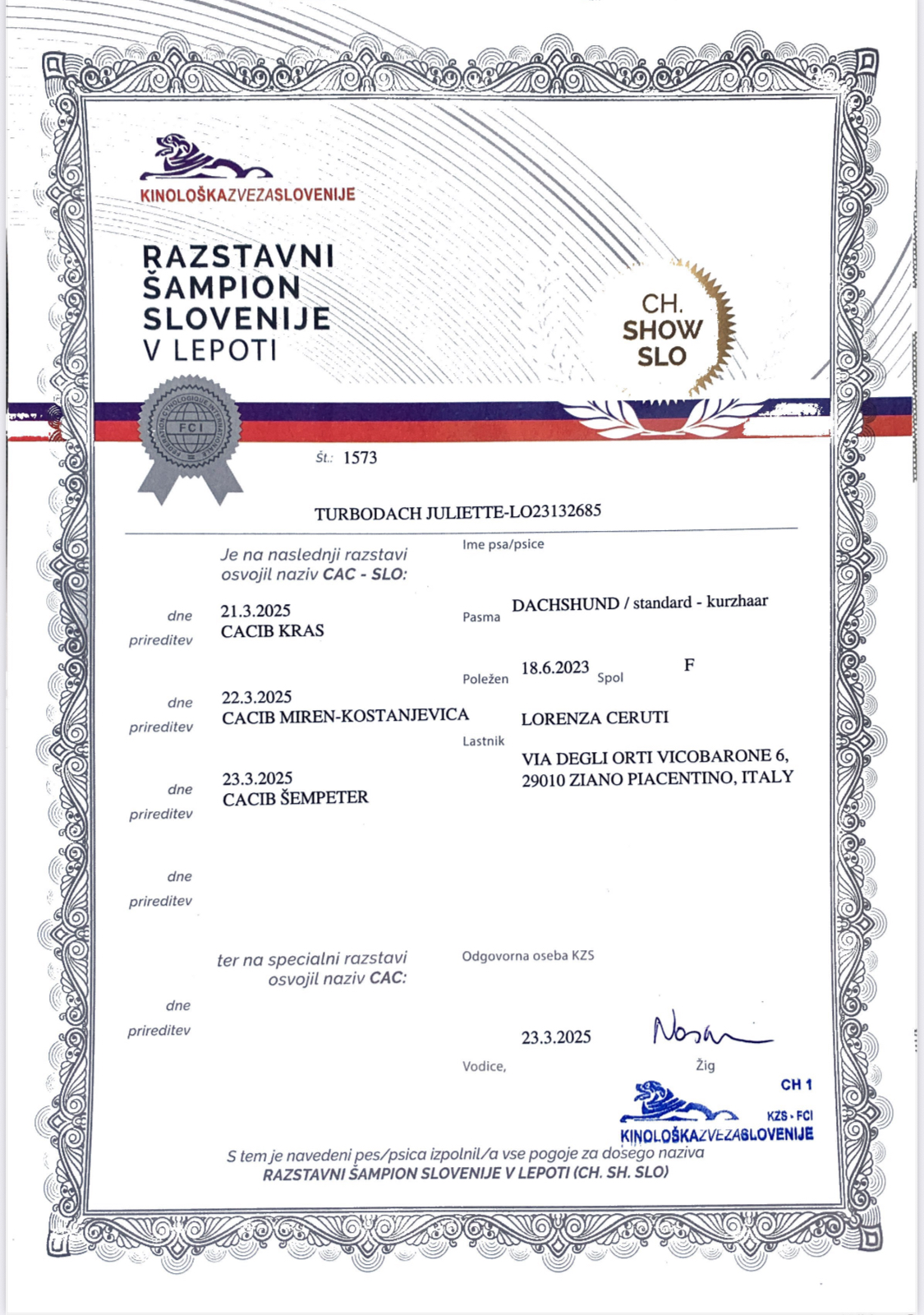 🇮🇹 CAMPIONESSA ITALIANA 🇸🇮 CAMPIONESSA SLOVENA DATA DI NASCITA: 18/06/2023 padre: MultiCh Maiola’s Da’ Vinci S/S madre: MultiCh Kristal di Turboland S/S